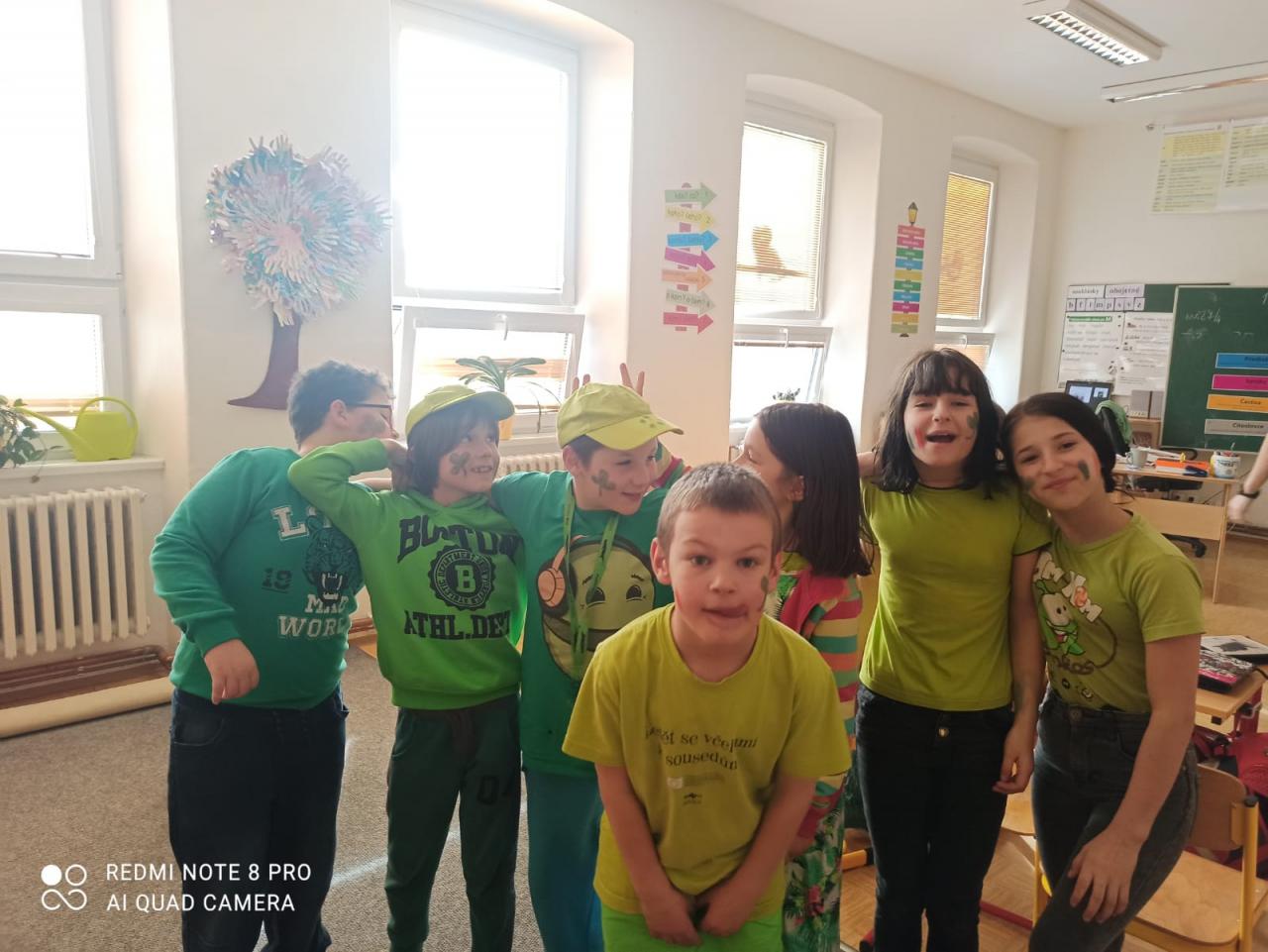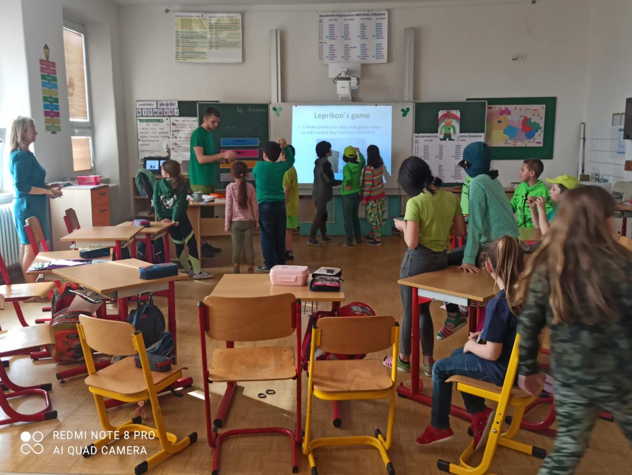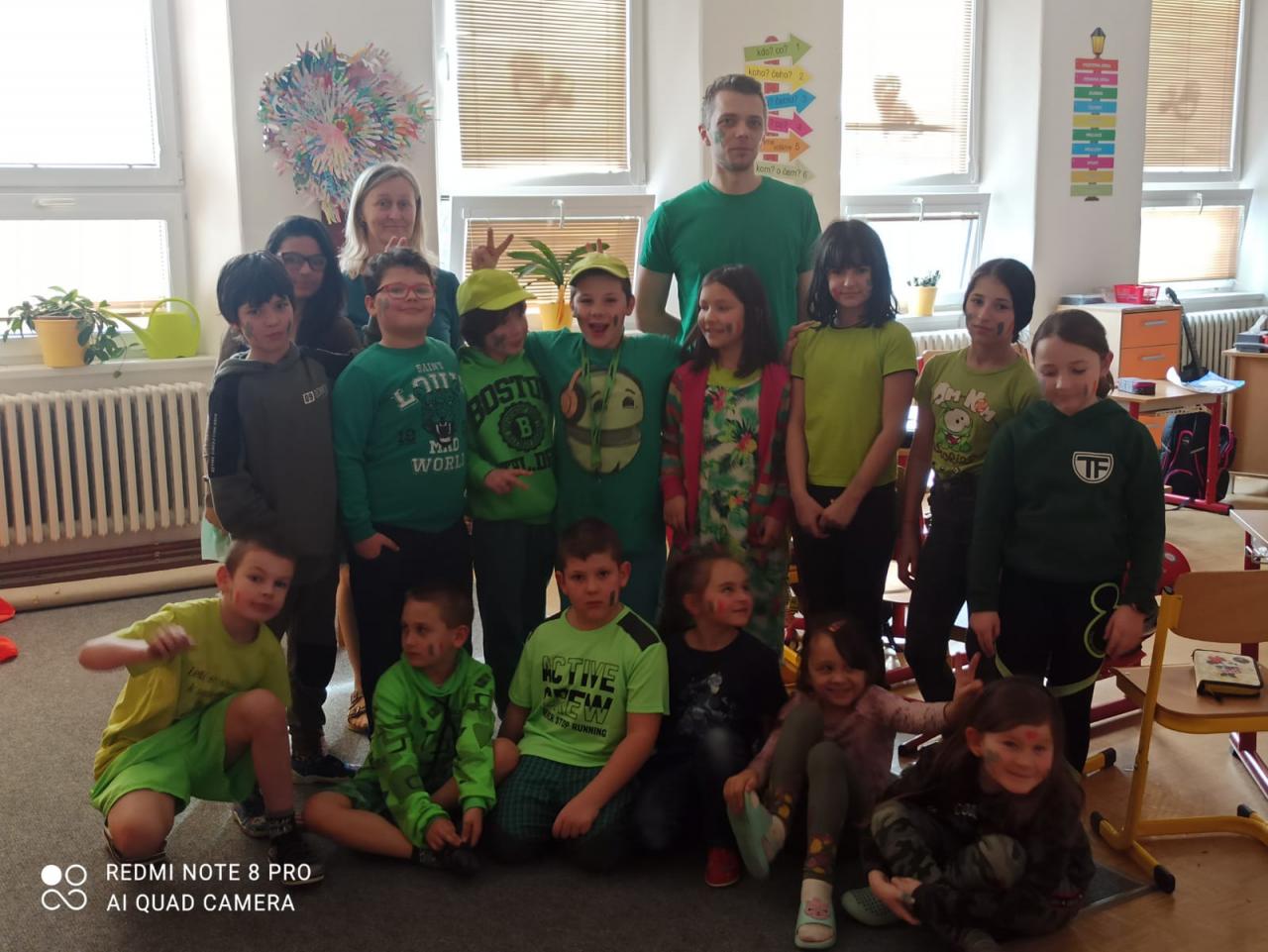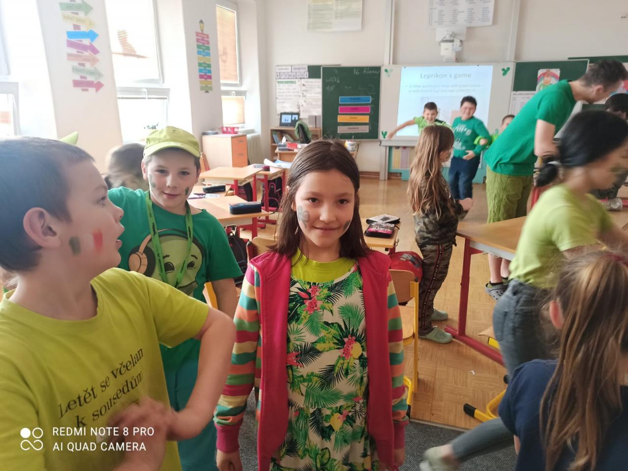 Všichni jsme do školy dorazili v zelené. Patron Irska - svatý Patrik, o něm jsme si povídali, zdokonalovali se přitom v angličtině a na závěr nám Leprgnóm pěkně zavařil hlavy, když jsme hledali jeho poklad schovaný pod duhou... :)
